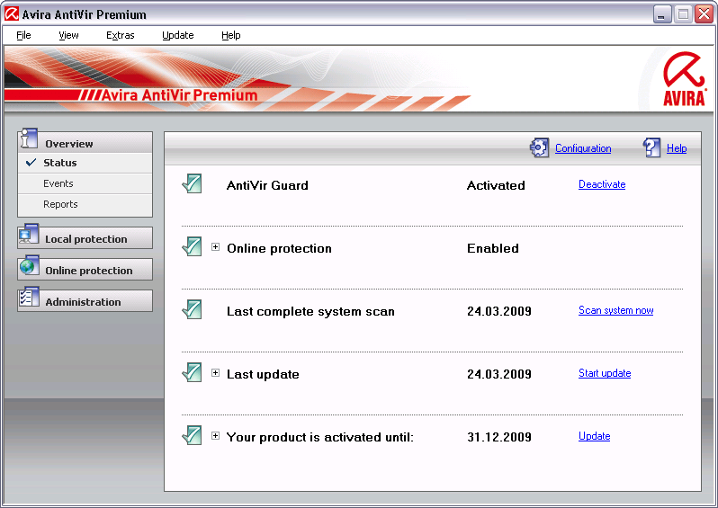 AntiVir Avira AntiVir Premium ofrece una protección eficaz contra los virus informáticos para el individuo y el uso privado de una sola estación de trabajo PC. Detecta y elimina virus e incluye una Internet-Asistente para actualización de fácil actualización. La construido en Virus Guard residente sirve para vigilar los movimientos de archivos automáticamente, por ejemplo, cuando la descarga de archivos desde Internet. Escaneo heurístico protege a la protección contra el anteriormente desconocido virus de macro. Aunque los virus han crecido muy numerosos, una cosa no ha cambiado: nuestro compromiso de proveerle con todo tipo de protección. La confiabilidad de AntiVir se demuestra en numerosos prueba de comparación y las referencias que aparecen en revistas profesionales independientes.